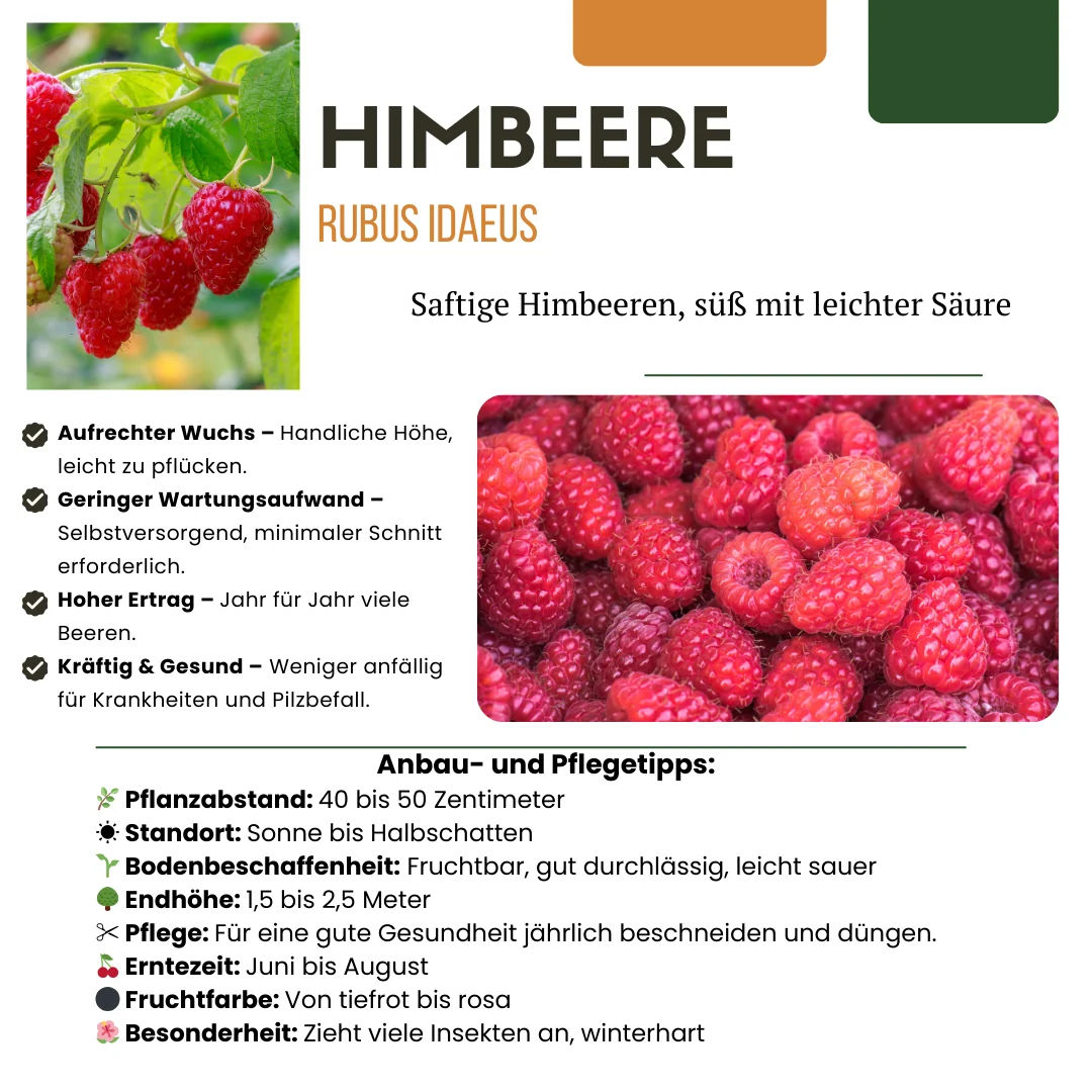 ![]() | Mit unserer biologischen Himbeerpflanze entführst du deinen Garten in die Welt der frischen Früchte. Diese robuste Rubus idaeus bringt nicht nur süße Himbeeren auf deinen Tisch, sondern fördert auch die Biodiversität in deinem Garten. Vorteile: