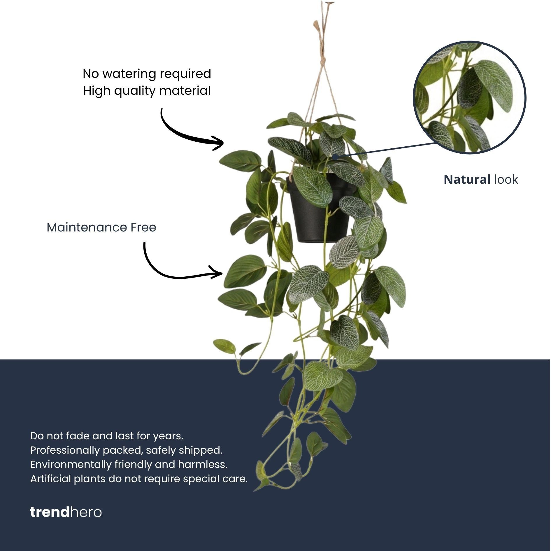 Hol dir mit der Fittonia Hängepflanze sofort Grün in dein Zuhause – eine pflegefreie, künstliche Lösung mit realistischen, hängenden Trieben und detaillierten Blättern. Sie kommt fertig gestylt im schwarzen Topf mit natürlichem Rope-Hänger und ist direkt bereit zum Aufhängen. Vorteile: