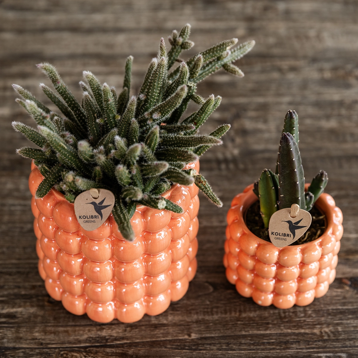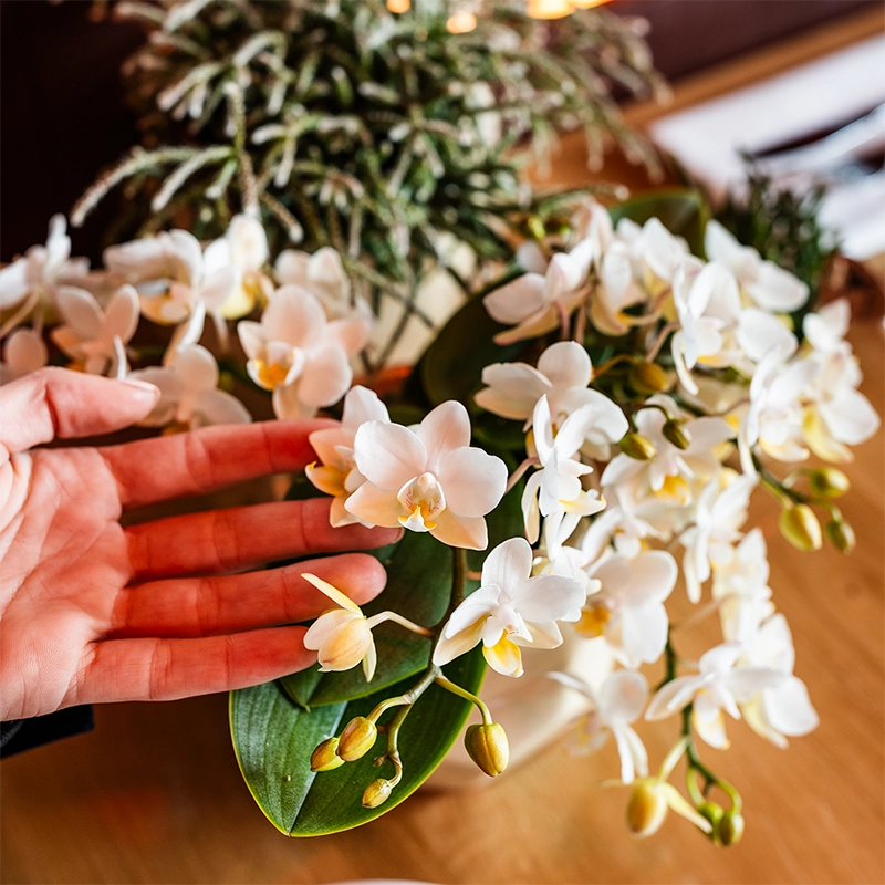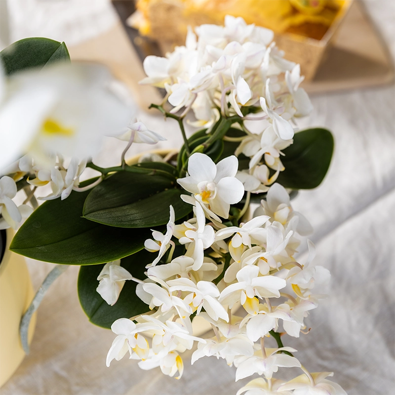 Dieses fröhliche Pflanzenset kombiniert eine elegante weiße Nazare Orchidee (Ø 9 cm) mit einer kleinen Grünpflanze (Ø 6 cm) – arrangiert in verspielten Poppy Orange Übertöpfen. Das auffällige Blasendesign sorgt für einen modernen, warmen Blickfang in deinem Wohnraum. Vorteile: